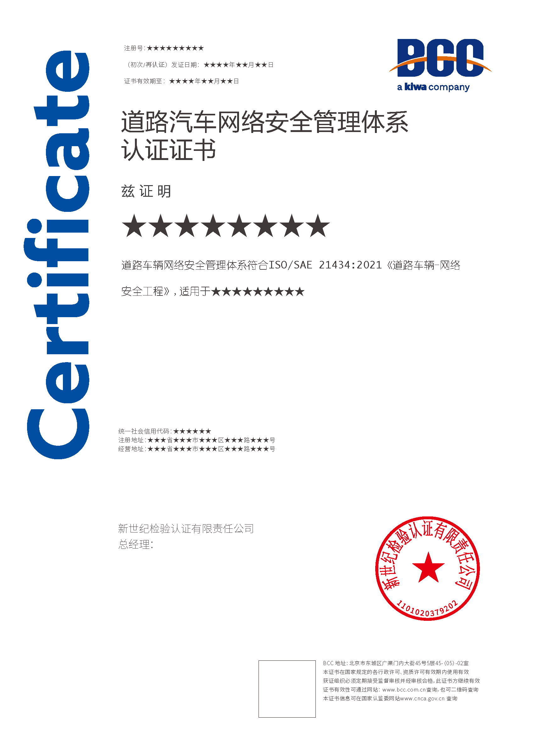 本頁涉及的認證服務中均有對應的《認證實施規則》,BCC擁有其最終解釋權。任何組織及個人未經BCC許可,不得以任何形式全部或部分使用(法律要求除外)認證相關信息。如需獲取相關實施規則請用以下方式聯系獲取:電話:010-58579316 郵箱:fwjs@kiwa.cn