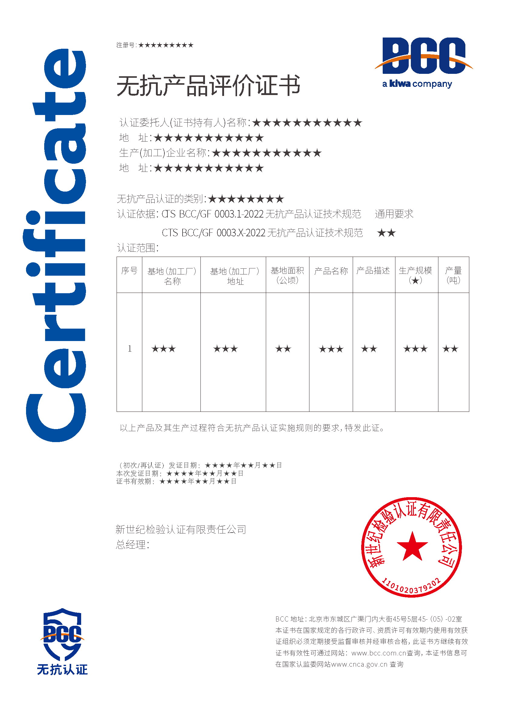 本頁涉及的認證服務中均有對應的《認證實施規則》,BCC擁有其最終解釋權。任何組織及個人未經BCC許可,不得以任何形式全部或部分使用(法律要求除外)認證相關信息。如需獲取相關實施規則請用以下方式聯系獲取:電話:010-58579316 郵箱:fwjs@kiwa.cn