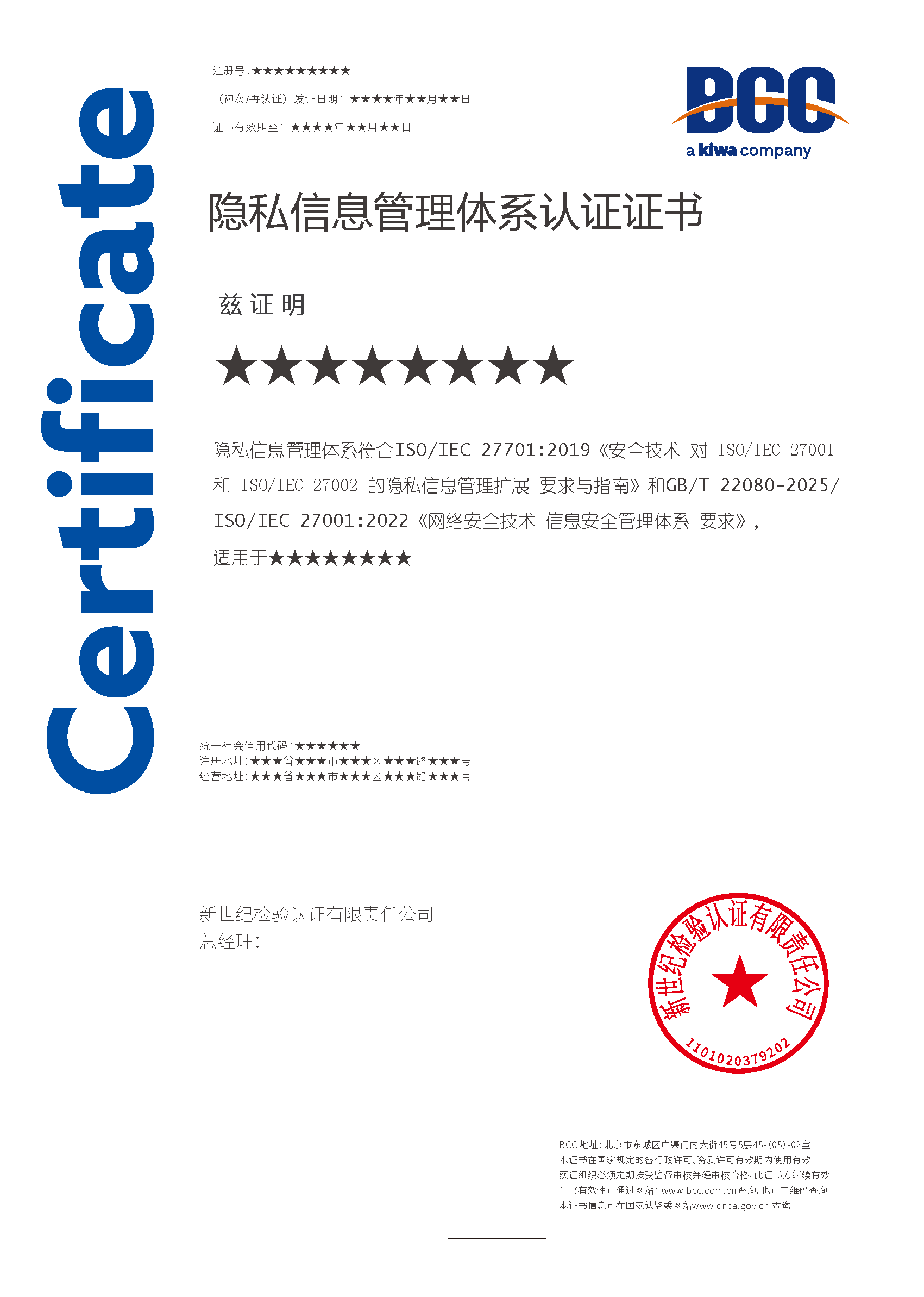 本頁涉及的認證服務中均有對應的《認證實施規則》,BCC擁有其最終解釋權。任何組織及個人未經BCC許可,不得以任何形式全部或部分使用(法律要求除外)認證相關信息。如需獲取相關實施規則請用以下方式聯系獲取:電話:010-58579316 郵箱:fwjs@kiwa.cn