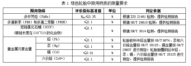 3、環境屬性。參照已發布并實施的《輪胎中限用物質的限量要求》國家標準,對輪胎胎面、胎側、胎圈(除鋼絲以外部分)、三角膠、內襯層、內胎、墊帶、胎圈鋼絲等各部位的多環芳烴(PAHs)、重金屬(鉛、汞、鎘、六價鉻)、短鏈氯化石蠟(SCCP)、多溴聯苯(PBB)和多溴二苯醚(PBDE)等限用物質提出了要求,具體評價指標基準值及判定依據詳見表1。